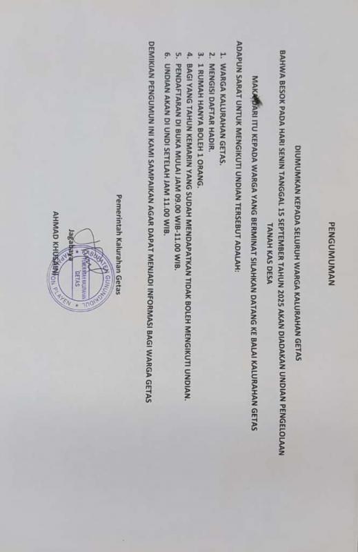 Getas, Pemerintah Kalurahan Getas melalui Jagabaya ( Ahmad Khusaini) malaksanakan undian pengelolaan Tanah Kas Desa Kalurahan Getas pada hari senin tanggal 15 September 2025 bertempat di Aula Kalurahan Getas pada jam 09.00- Selesai. Untuk Tanah Kas sendiri yang di undi berjumlah dalam jangka waktu penggarapan selama 3 tahun.