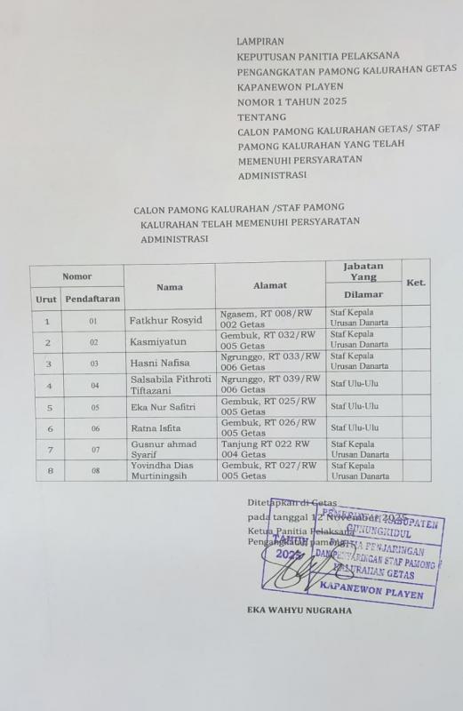 Getas, Pemerintah Kalurahan Getas melalui TIM Panitia Pengisian staf Danarta dan staf Ulu -ulu Kalurahan Getas tahun 2025 melakukan penelitian Persyaratan Administrasi calon staf Danarta dan staf Ulu -ulu pada hari Rabu tanggal 12 November 2025 jam 10.00- ada 8 ( delapan ) pendaftar yang memenuhi syarat :